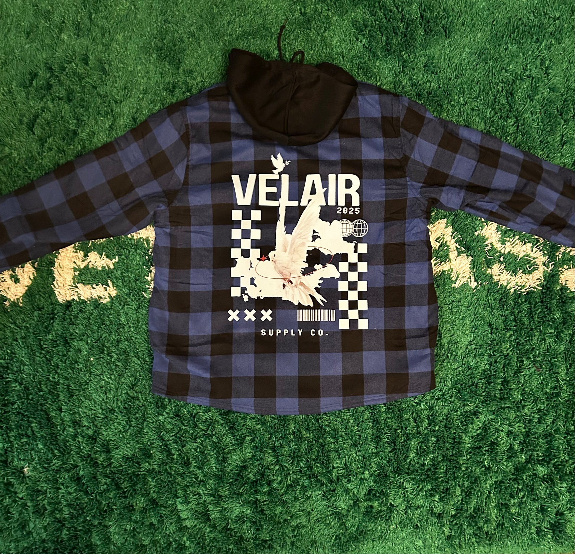 The Flocka Quilted Lined Jacket takes workwear DNA and upgrades it with Velair’s signature motion graphic. Built on a blue-and-black buffalo plaid shell, the back features the Flocka artwork: doves in flight, checkerboard distortion, global iconography, and the VELAIR 2025 mark locking in the story of movement and elevation.