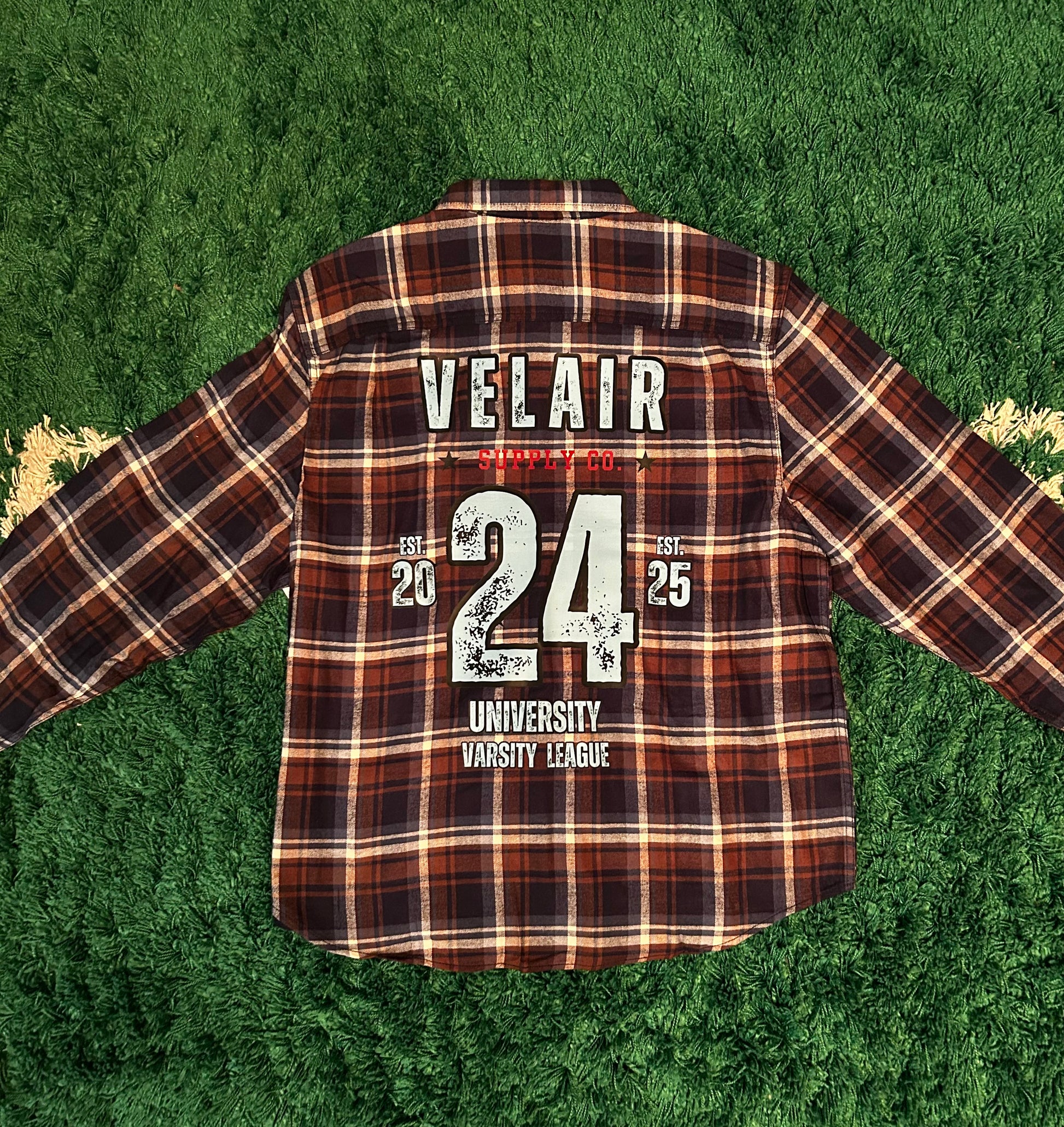 This flannel clocks in with pure campus-royalty energy. The Velair University Flannel delivers that rugged Northwest grit blended with classic collegiate swagger. Built on a premium plaid body, the back graphic hits hard with our signature VELAIR 24 varsity print – distressed, bold, unapologetically competitive.