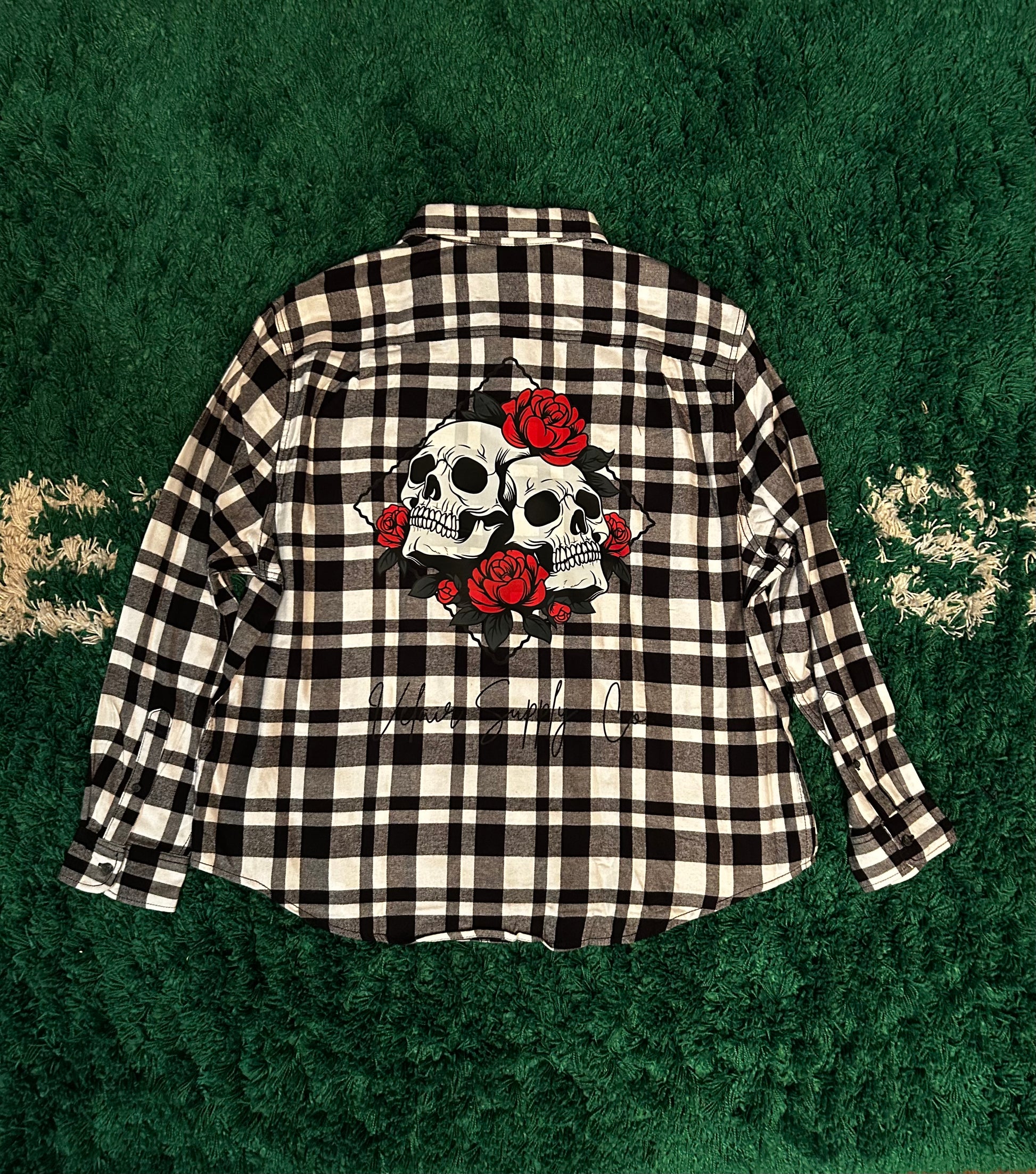 This one hits different. The Velair Red Roses Flannel takes classic Northwest plaid and pushes it straight into statement-piece territory. Built on a heavyweight black-and-white check base, the back print features our signature triple-skull motif wrapped in bold red roses — a graphic blend of grit, beauty, and unapologetic edge.